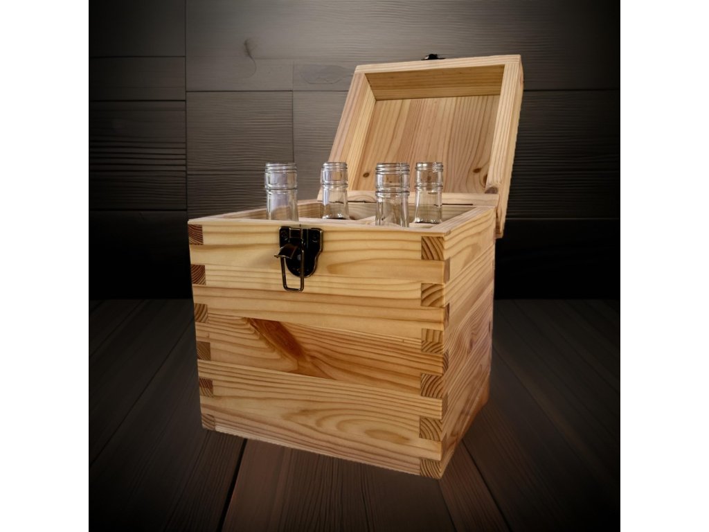 Táto robustná debnička z masívneho borovicového dreva je navrhnutá na bezpečné a štýlové uloženie až štyroch fliaš. S prírodným vzhľadom a remeselným spracovaním je ideálnou voľbou pre tých, ktorí hľadajú elegantný darček alebo praktické riešenie.