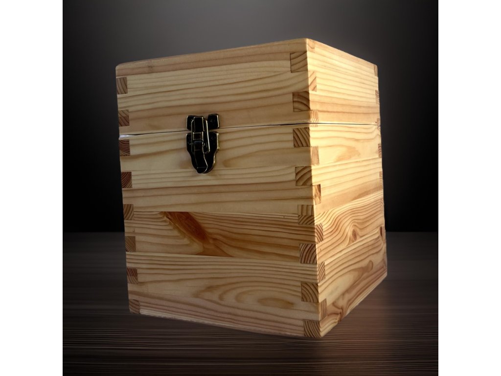Vyrobená z masívneho borovicového dreva s charakteristickou prírodnou textúrou a jemnou vôňou. Tento materiál dodáva krabičke elegantný vzhľad